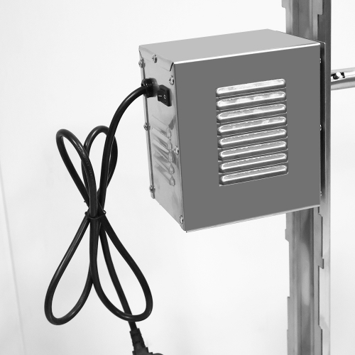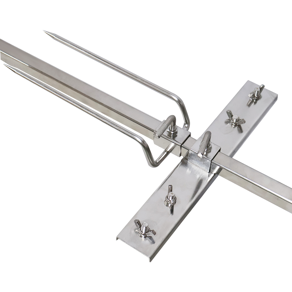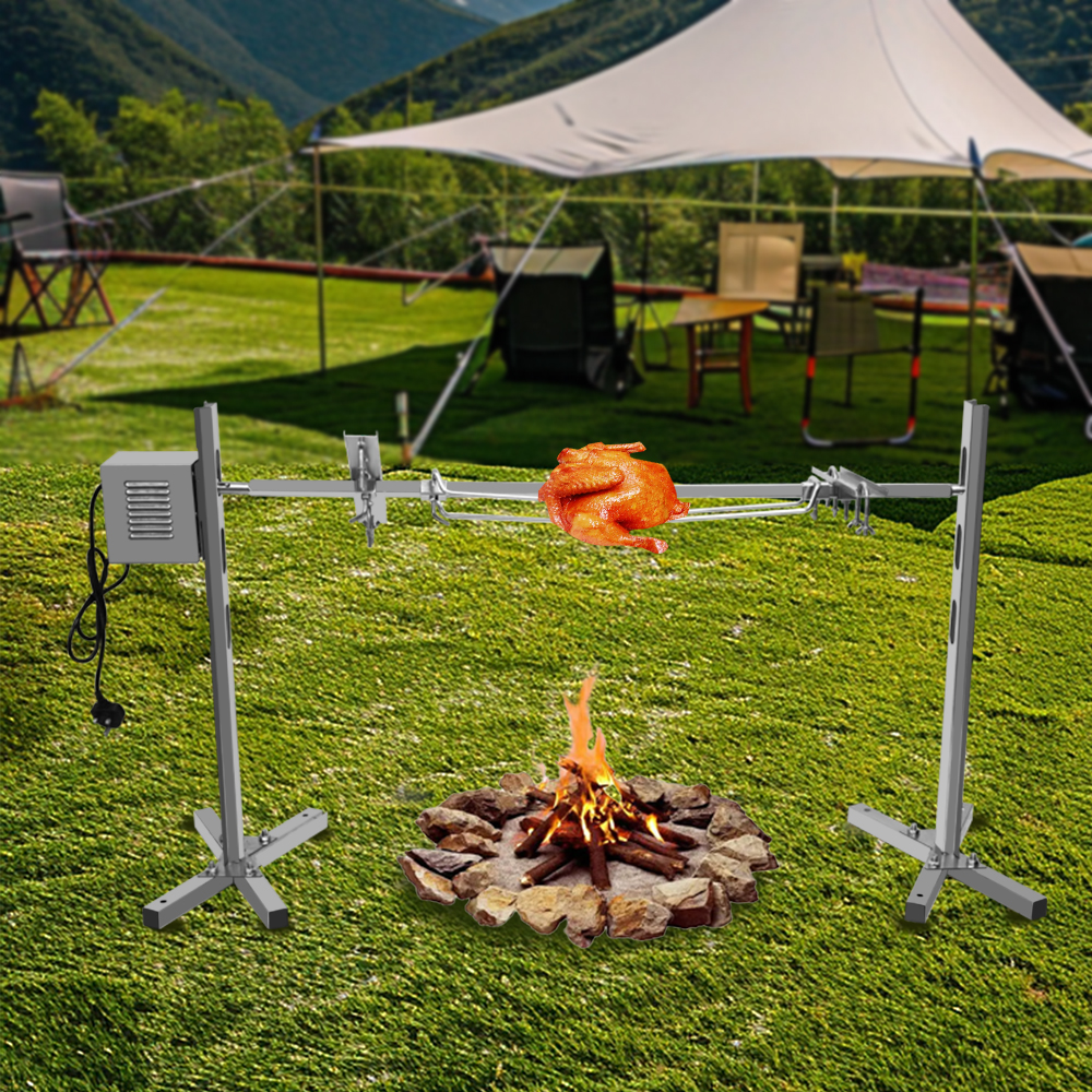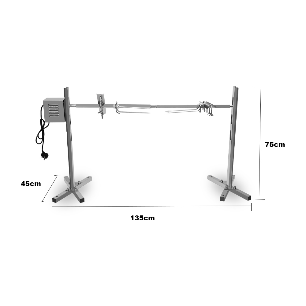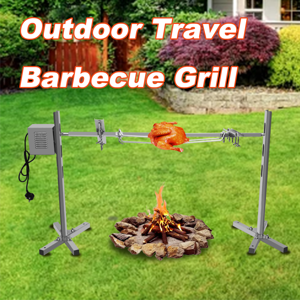 All made of high-quality stainless steel material, equipped with a motor, a long meat skewer made of 304 stainless steel, two leg fixed forks, and two adjustable forks